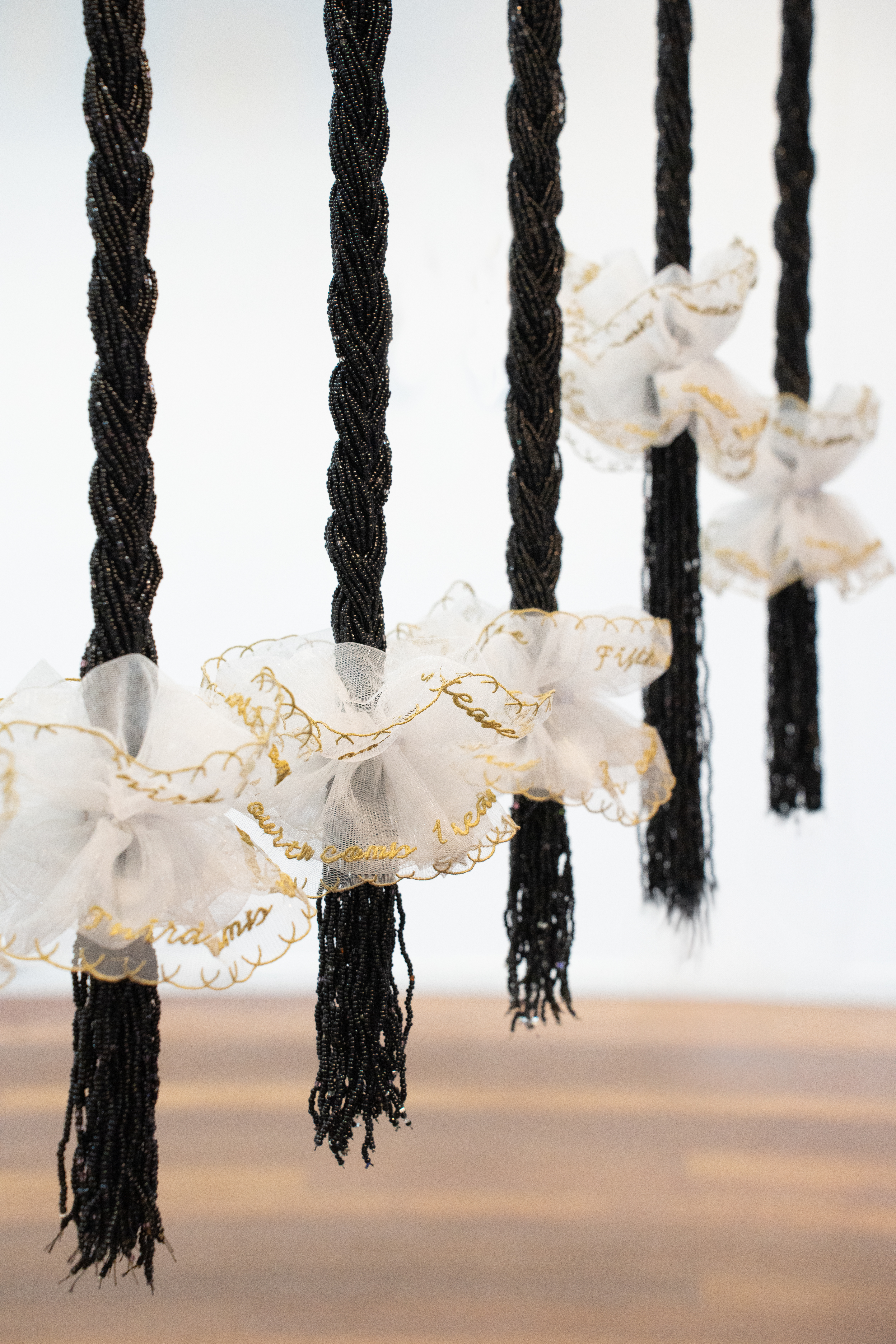 Echoing the traditional Cantonese “three-comb” wedding ritual, the work extends this oral rhythm into a personal myth: a continuous act of separation and remembrance. Inspired by the beaded door curtains commonly found in Chinese homes, the work echoes the threshold between mother and daughter, a gentle partition where leaving and belonging coexist.