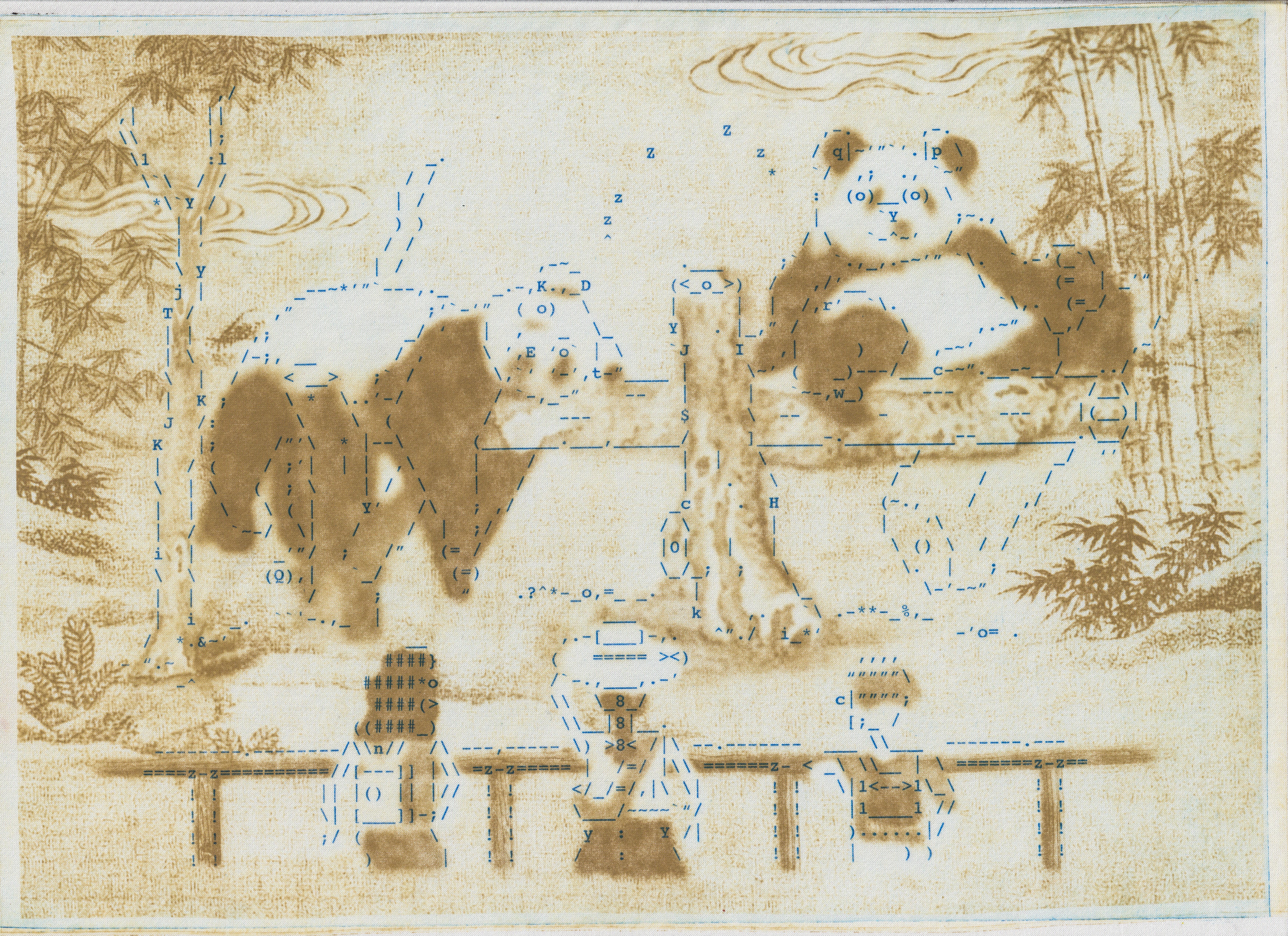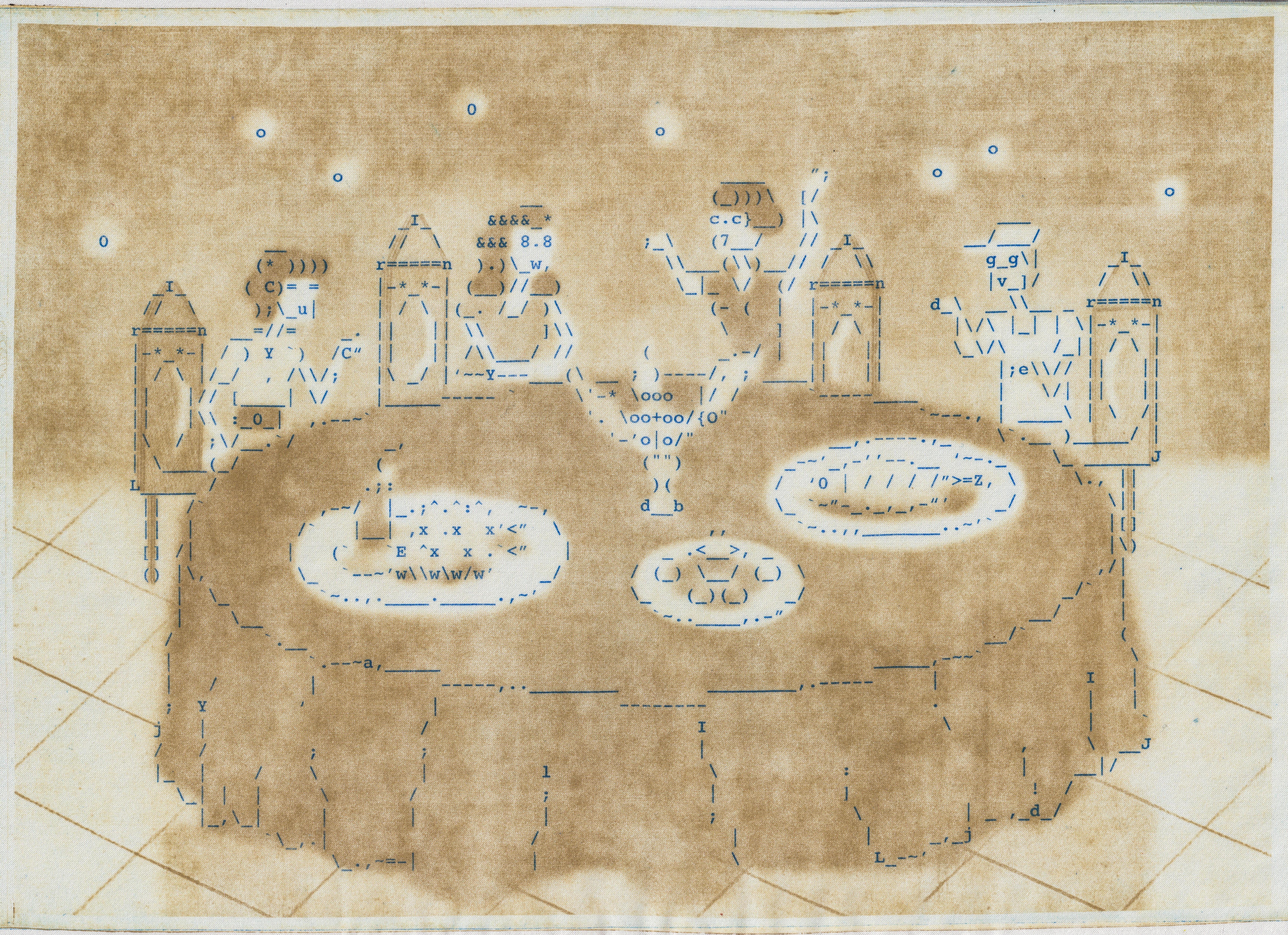 This project intends to visualize and materialize these children's memories through early internet visual art. A series of ASCII drawings on two-color Toyobo prints on silk are made, visualizing a selection of blogs written between 2003 and 2012. A box kite consisting of eight silk Toyobo prints and a video will be created in a later phase.