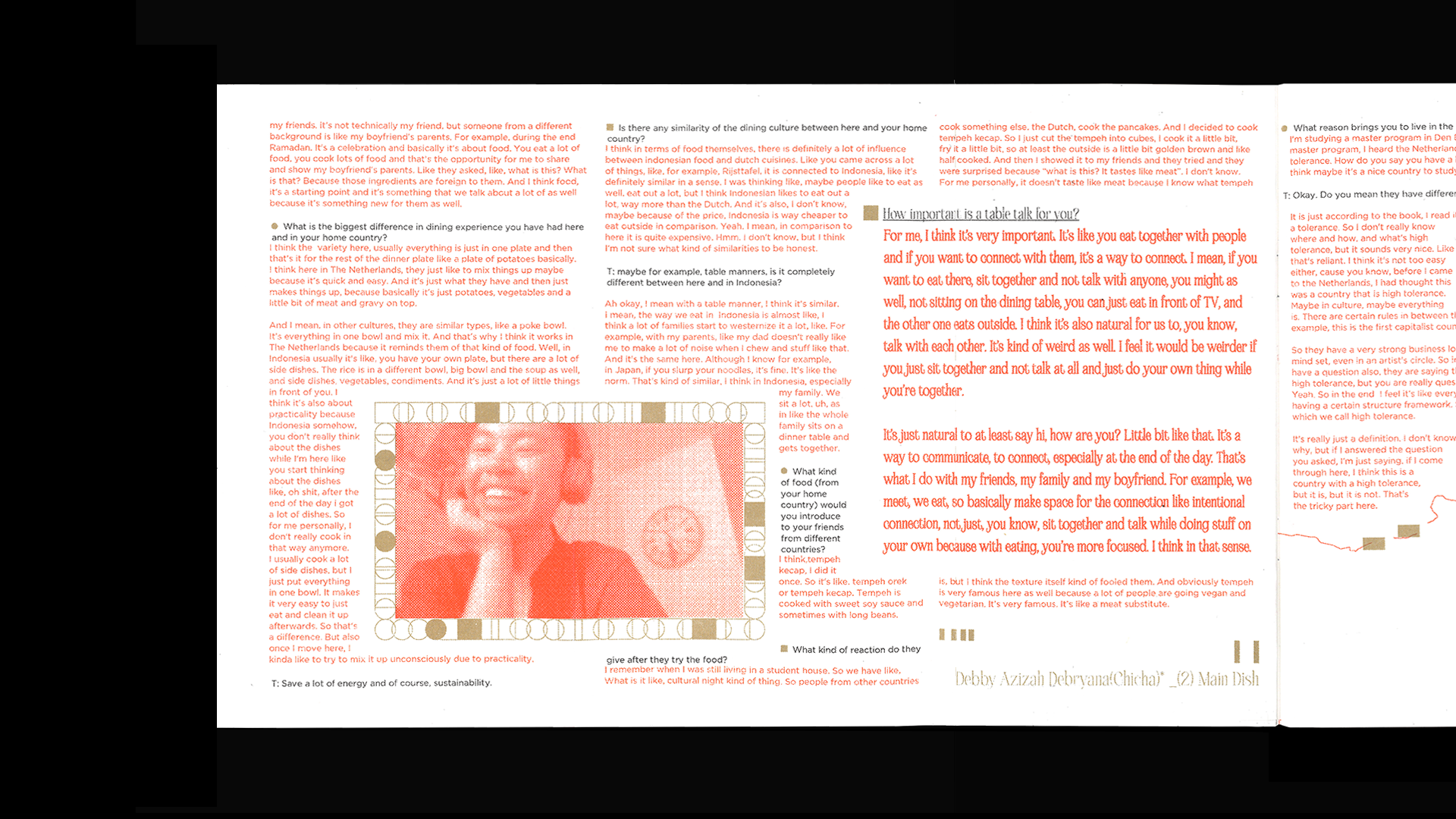 Round-Rectangle-Table talk is a zine about introducing Asian dining cultures in The Netherlands. It consists of 5 interviews of Asians living in The Netherlands. They share experiences about their struggles, problems, Asian food, and how they introduce their culture to foreigners around them through conversation on a dining table.