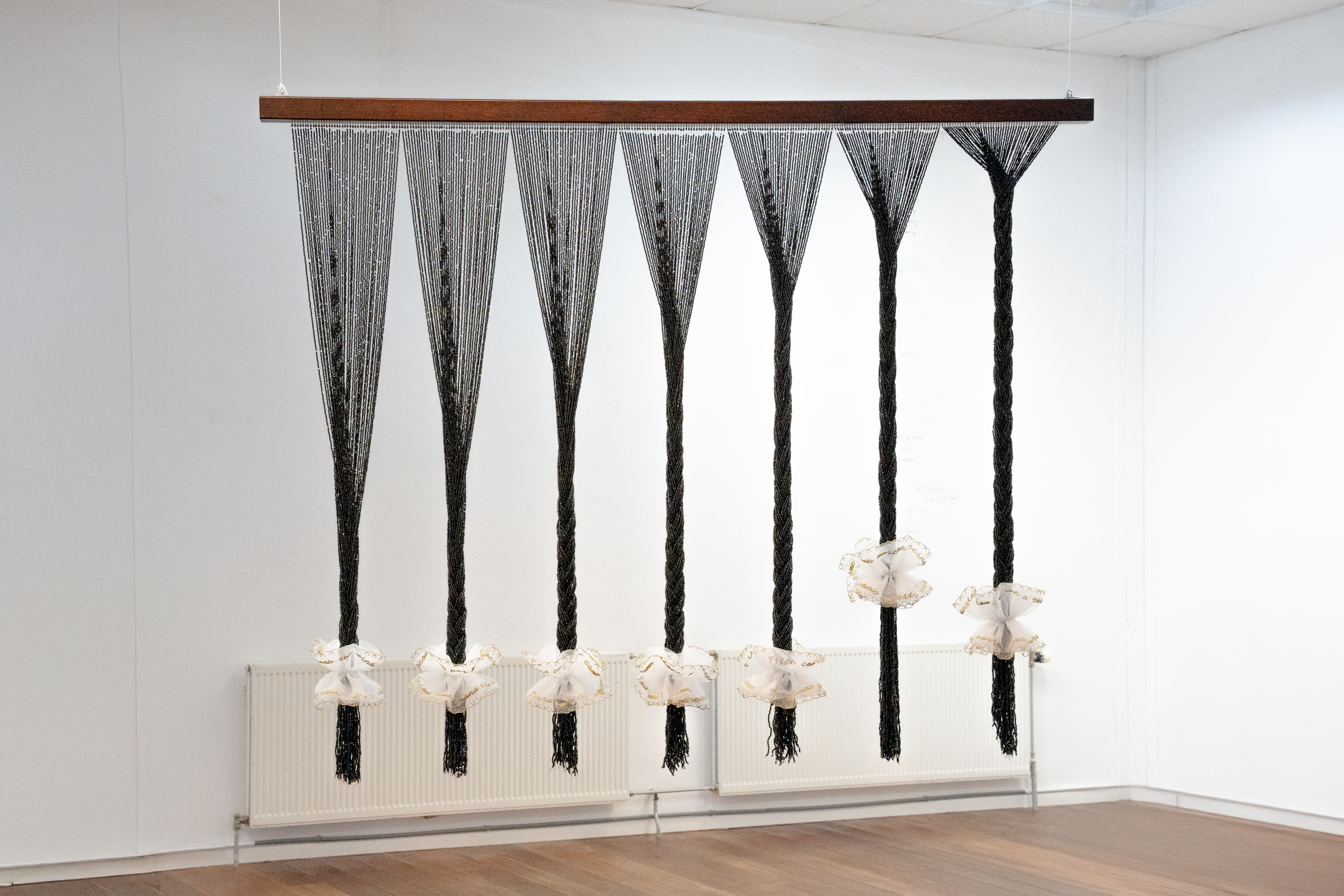 Echoing the traditional Cantonese “three-comb” wedding ritual, the work extends this oral rhythm into a personal myth: a continuous act of separation and remembrance. Inspired by the beaded door curtains commonly found in Chinese homes, the work echoes the threshold between mother and daughter, a gentle partition where leaving and belonging coexist.
